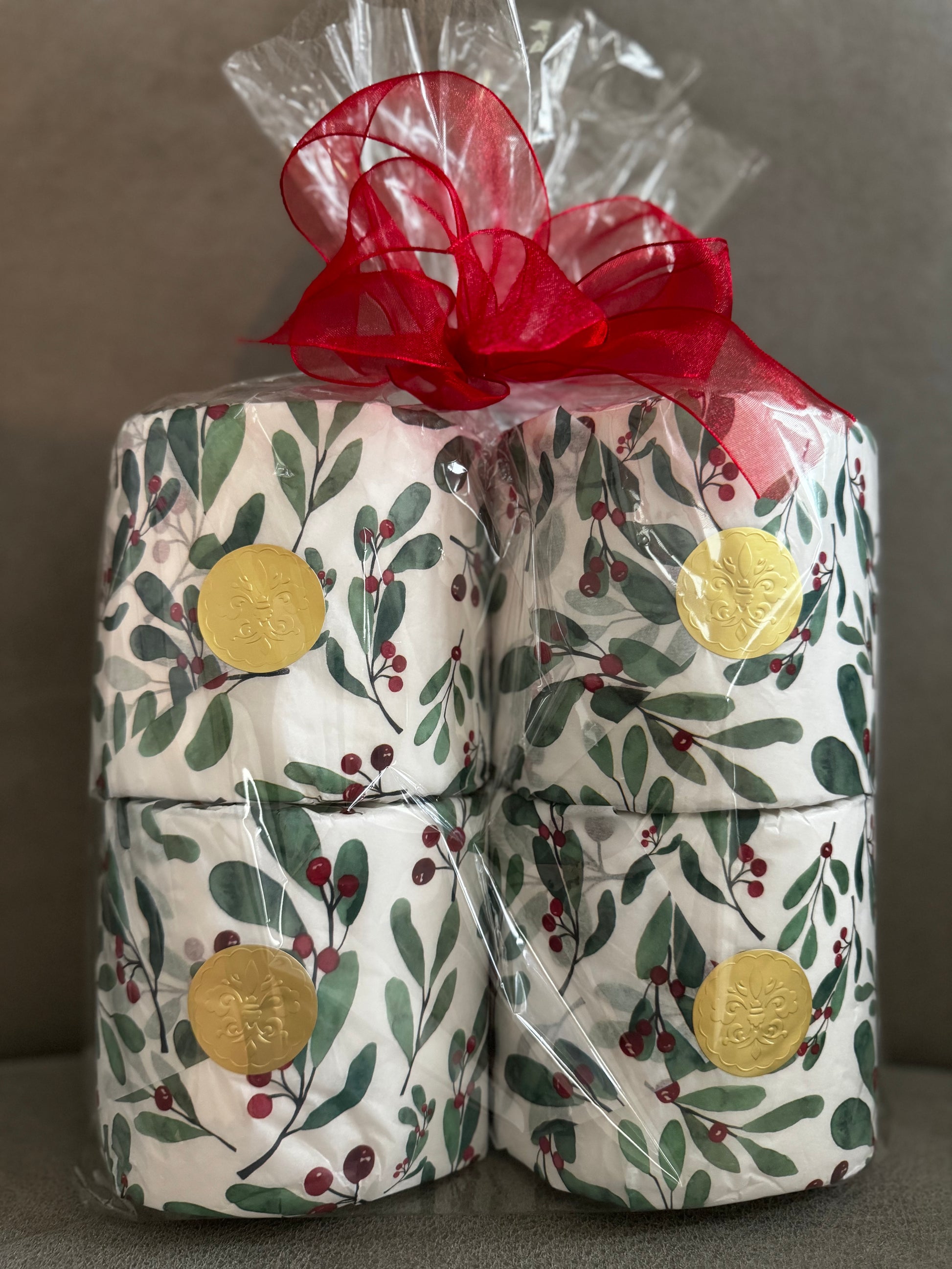 Elevate your holiday decor with our Mistletoe & Berries Luxury Bathroom Tissue Gift Set, designed to infuse your bathroom with seasonal cheer and elegance. This enchanting set features premium bathroom tissue wrapped in a festive holiday-themed design, transforming an everyday item into a detailed charming holiday accent.