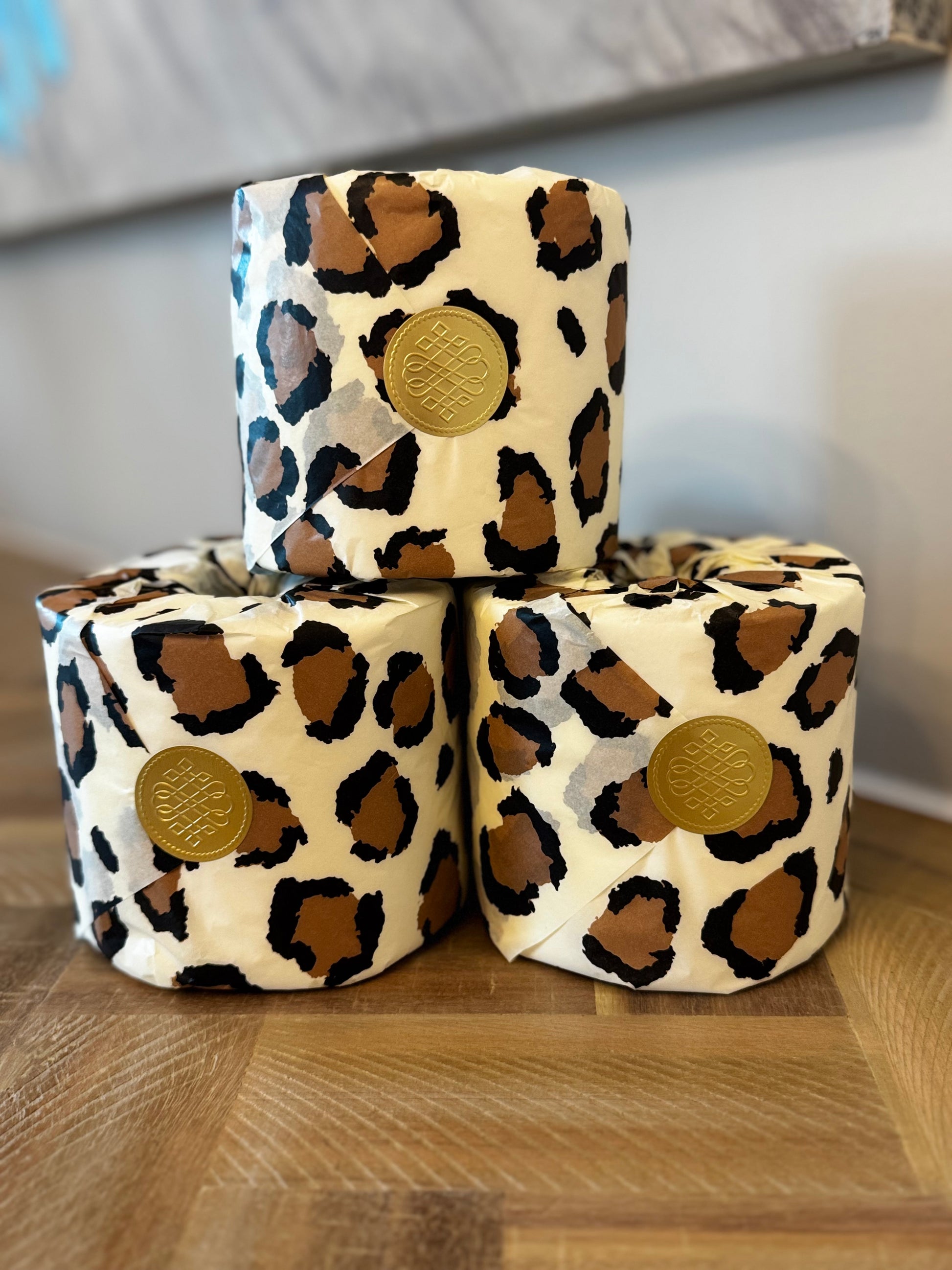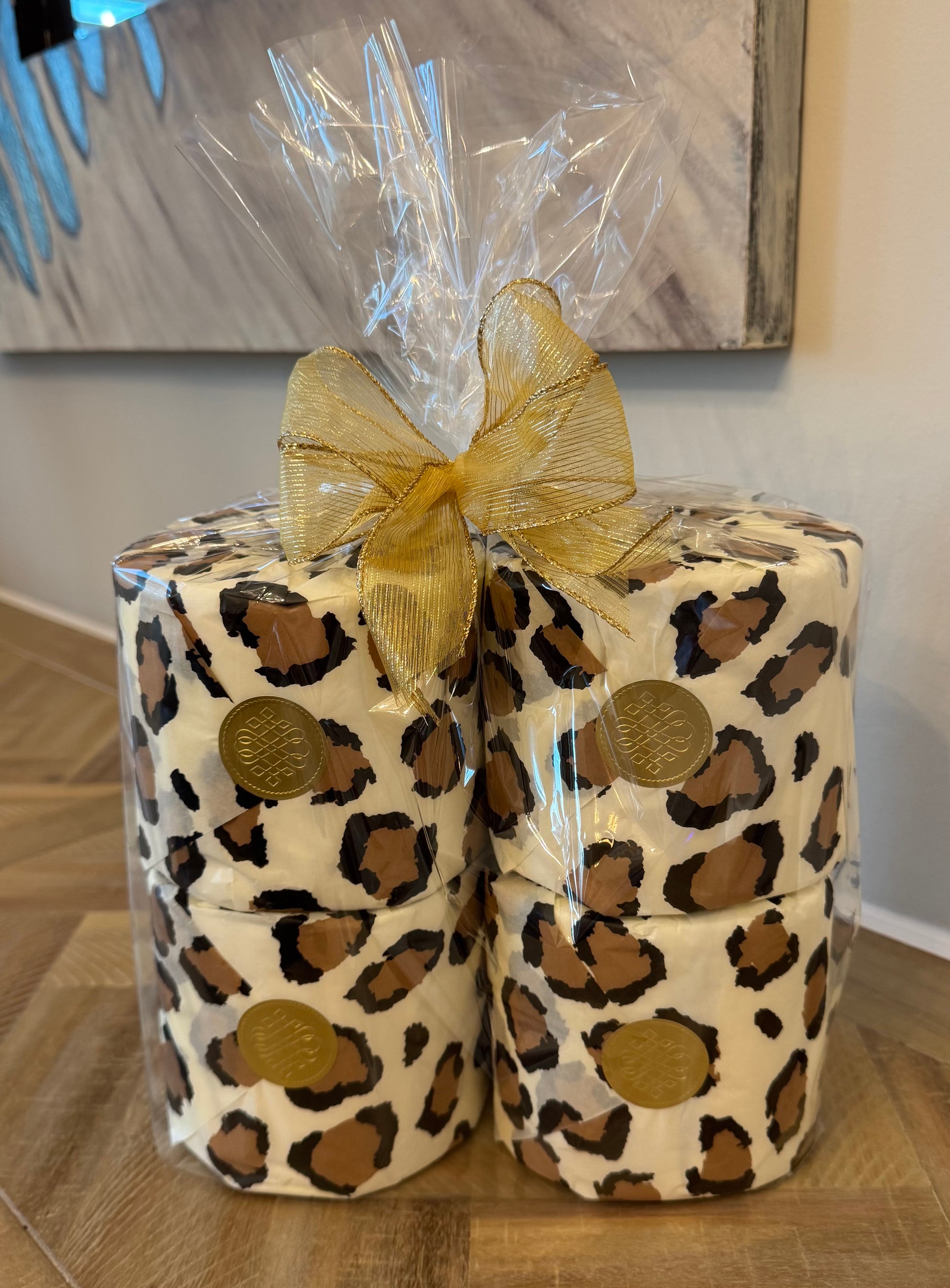 Elevate your bathroom/home decor with our Leopard Animal Print Bathroom Toilet Tissue Gift Package, designed to infuse your bathroom with detailed elegance. This enchanting set features premium bathroom tissue wrapped in a festive Leopard Animal Print themed designed tissue, transforming an everyday item into a charming detailed accent.